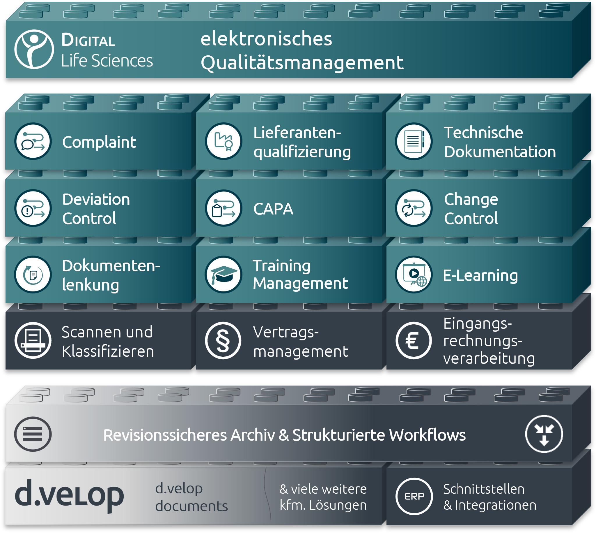 Die eQMS-Suite von Digital Life Sciences GmbH basiert auf einem integrierten ECM- und DMS-System, das höchsten Ansprüchen an Qualität und Compliance gerecht wird. Sämtliche Softwarelösungen können modular erweitert werden, um eine vollständige GxP-konforme eQMS-Suite zu bilden.