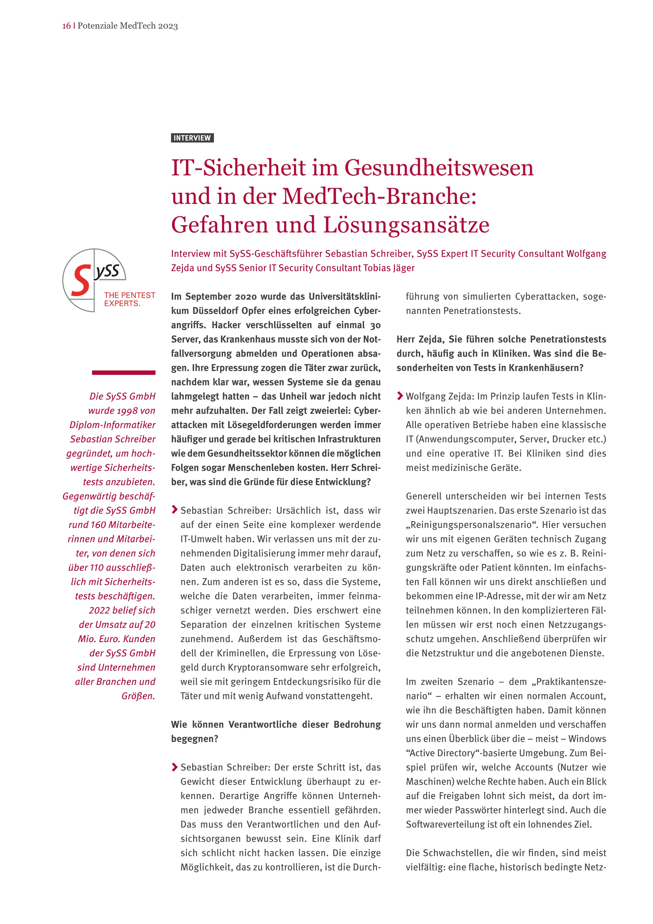 Im Interview mit „Potenziale MedTech“ erklärt die SySS GmbH, warum Cyberattacken auf Kritische Infrastrukturen mit Lösegeldanforderungen häufiger werden, welche Maßnahmen ergriffen werden sollten, um dieser Entwicklung entgegenzuwirken, und wie insbesondere Penetrationstests von der SySS beispielweise in Krankenhäusern und von Medizinprodukten sogar Leben retten können.