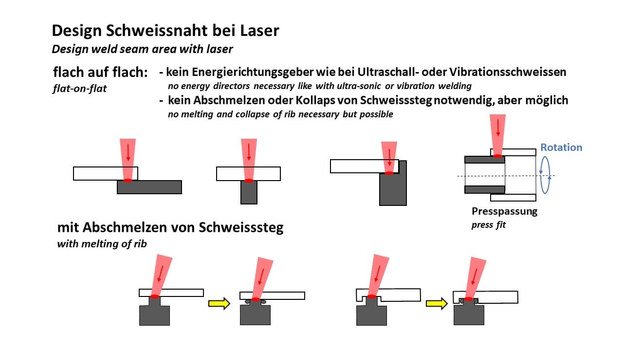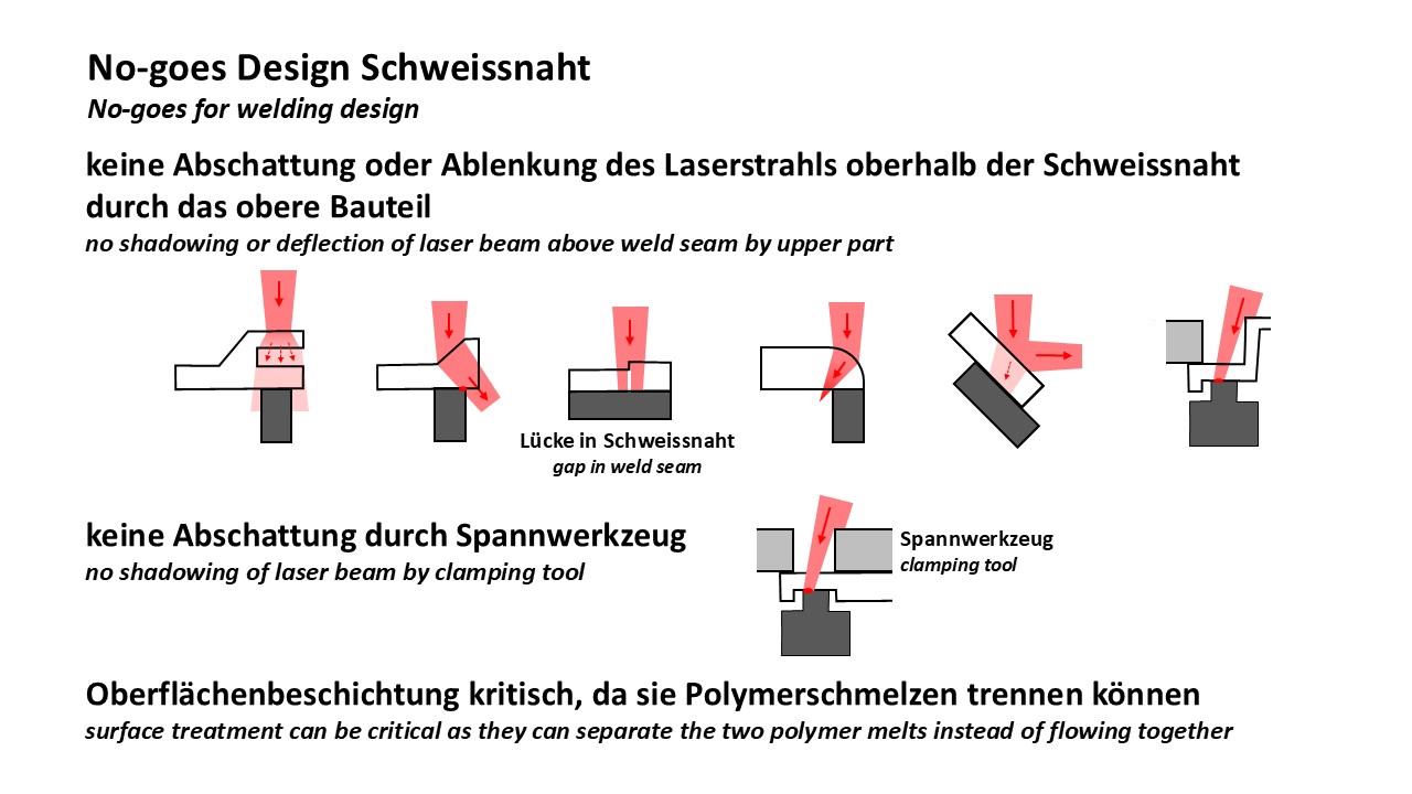 At the weld seam the two plastic parts must lie flat on flat on top of each other. And the upper parts must not deflect the laser beam on its way to the weld seam (see picture design rules and no-goes).