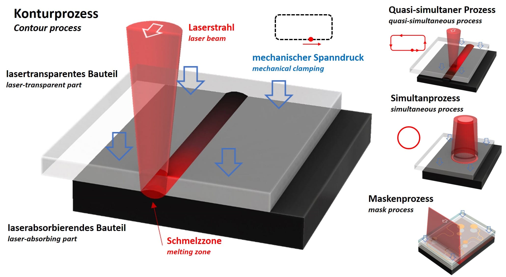 For converting the energy of the laser beam into heat in the contact area of the two parts, the upper one must be largely transparent to the laser and the lower one must absorb the laser.