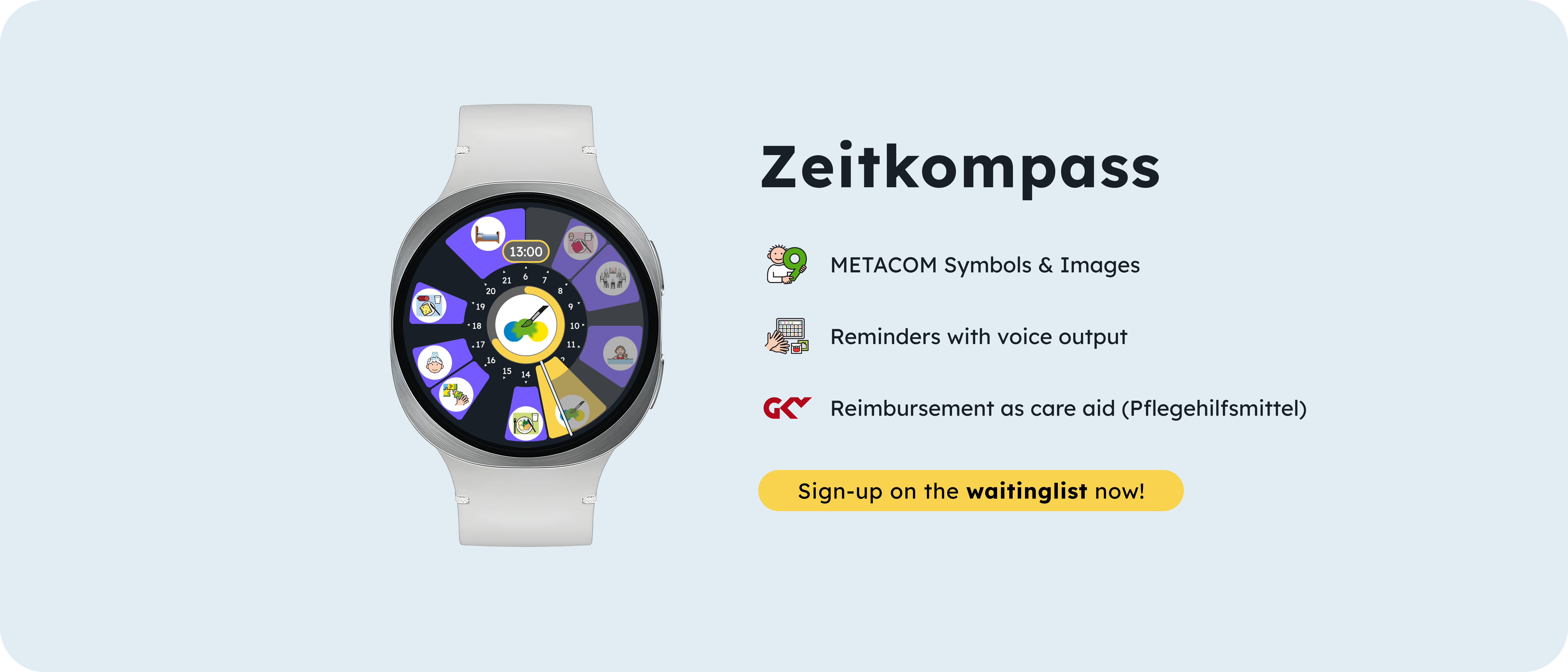 Live more independently with Zeitkompass. The watch helps making time and personal daily plans visible and understandable — to support independence in everyday life.