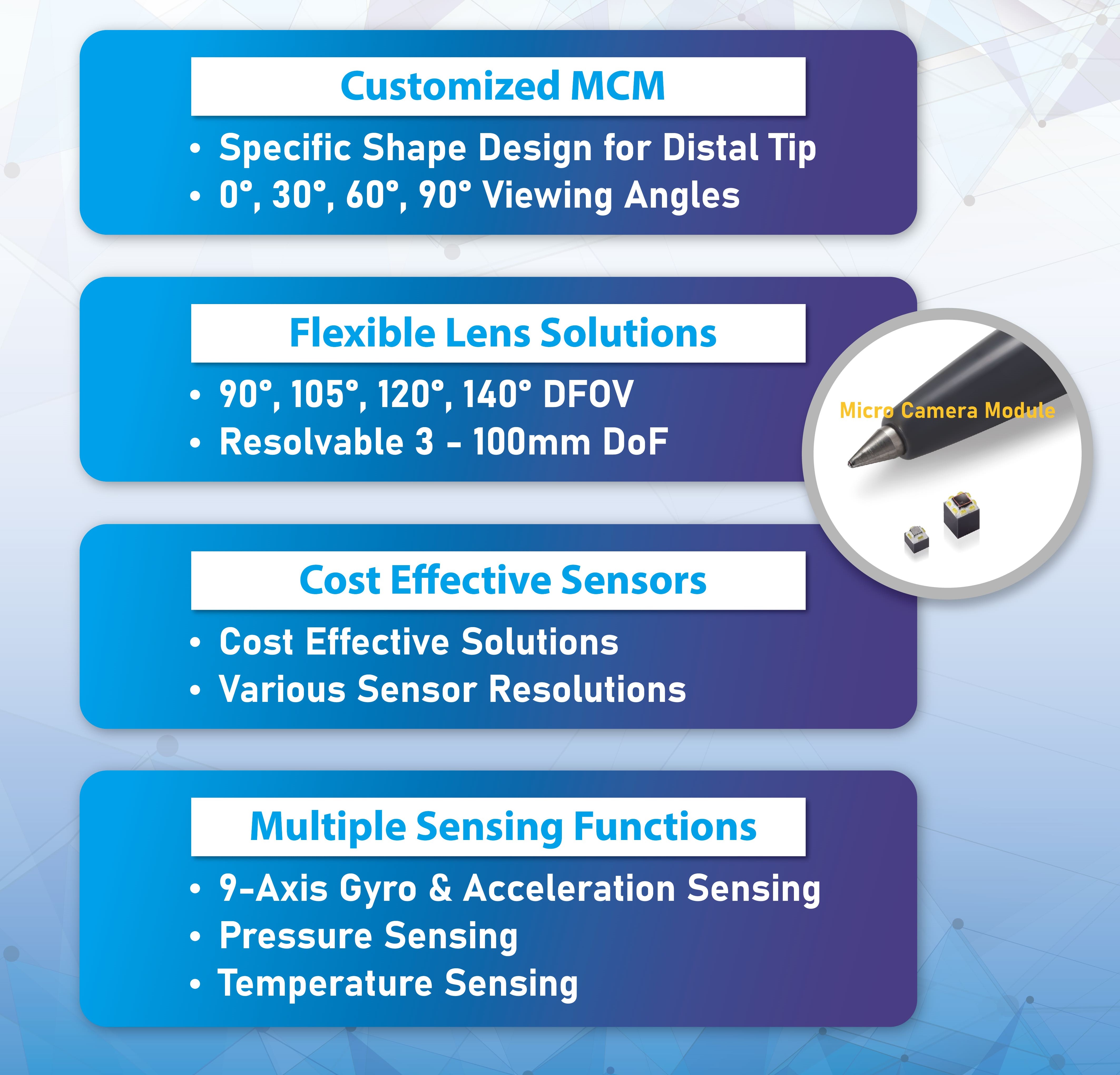 The Micro Camera Module (MCM) by Aitronics represents the cutting edge of medical imaging. By utilizing automated semiconductor packaging and unique encapsulation technology, we have developed one of the smallest camera solutions on the market without compromising on performance.