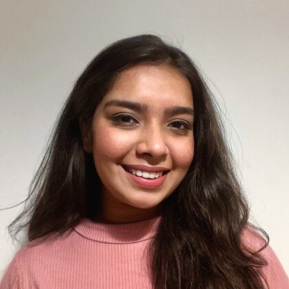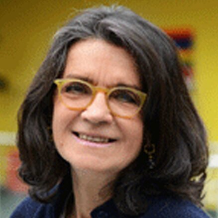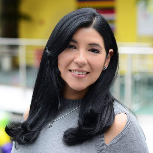 Smiling woman with long dark hair wearing a light green blazer and a white top. She is standing in a house with a blurred background showing large windows and a cityscape.